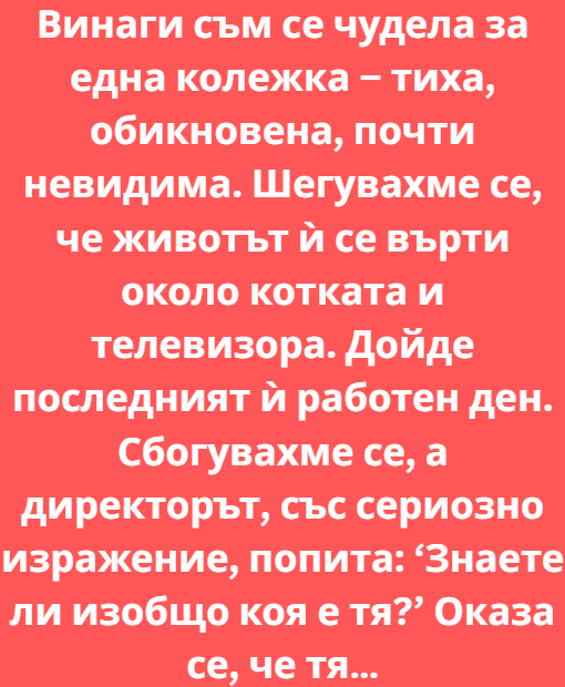 Беше вторник. Две седмици по-рано беше подала предизвестие, което мина почти незабелязано – просто формалност. Събрахме по десет лева за ваучер и букет. В четири следобед се събрахме около нейното бюро. Тя стоеше леко притеснена, държейки малка картонена кутия с двете си лични вещи – чаша с надпис и малка саксийка с кактус.