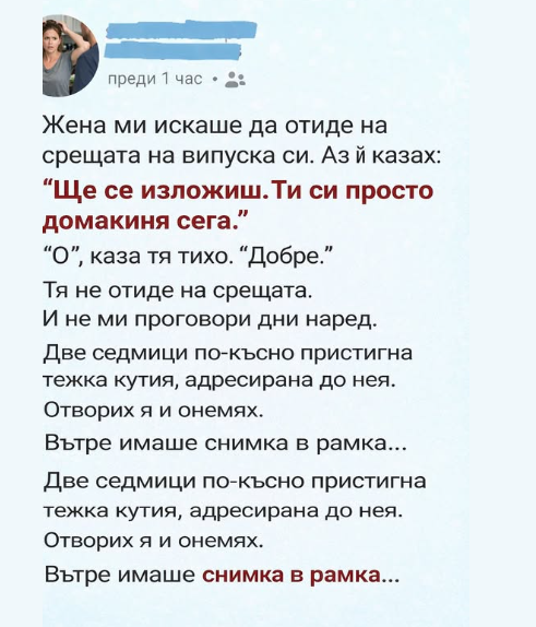 Тази история напомня как понякога един привидно незначителен момент може да отключи дълбоки промени в семейството. Не винаги осъзнаваме, че думите ни оставят трайни следи.