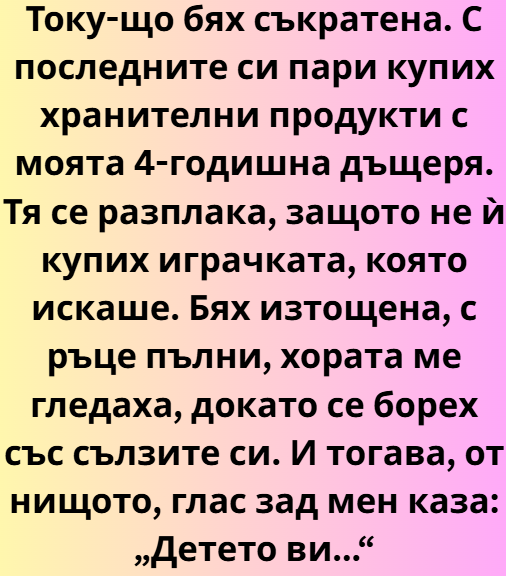 Току-що ме уволниха. С последните си пари купих храна, а до мен беше четиригодишната ми дъщеря. Тя заплака, защото отказах да ѝ взема желаната играчка. Аз едва се държах, ръцете ми бяха заети с торби, а хората наоколо ме наблюдаваха как се боря със сълзите си. В този момент, неочаквано, чух глас зад себе си: