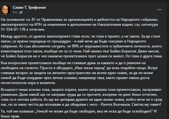 Слави Трифонов, начело на „Има такъв народ“, отправи пореден упрек към лидера на ГЕРБ Бойко Борисов. В публикация в социалните мрежи Трифонов заяви, че смята, че Борисов никога не е чел законопроект през живота си.