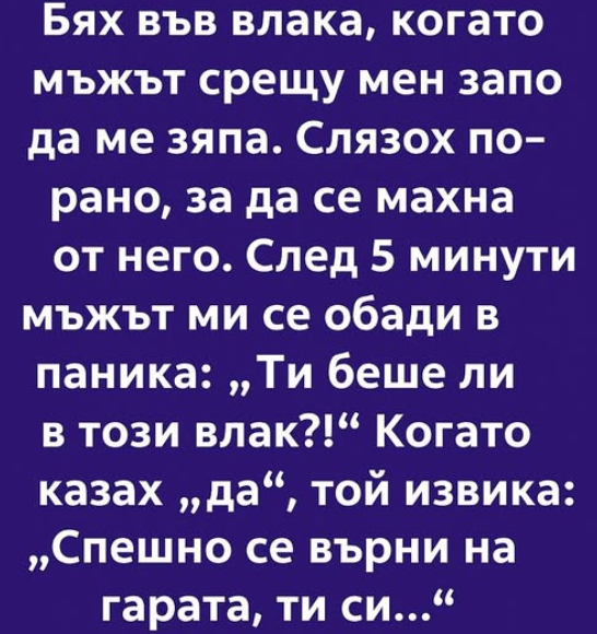 — ТИ БЯХА В ТОЗИ ВЛАК?! — гласът му беше пресекващ и почти хриптящ, сякаш тичаше, викаше и се задъхваше.